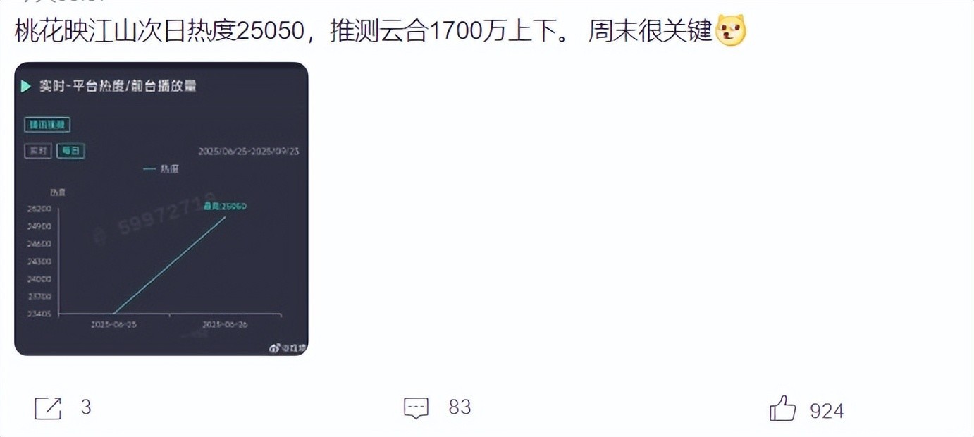 《桃花映江山》刚定档时,它的关注度是比较低的,随着剧情更新,首日热度就飙到23334,要知道,这样的成绩已经超过张晚意和景甜的《似锦》,开播第三天的时候,这部剧的热度竟突破25000,也就是说,热度是不断上升的。