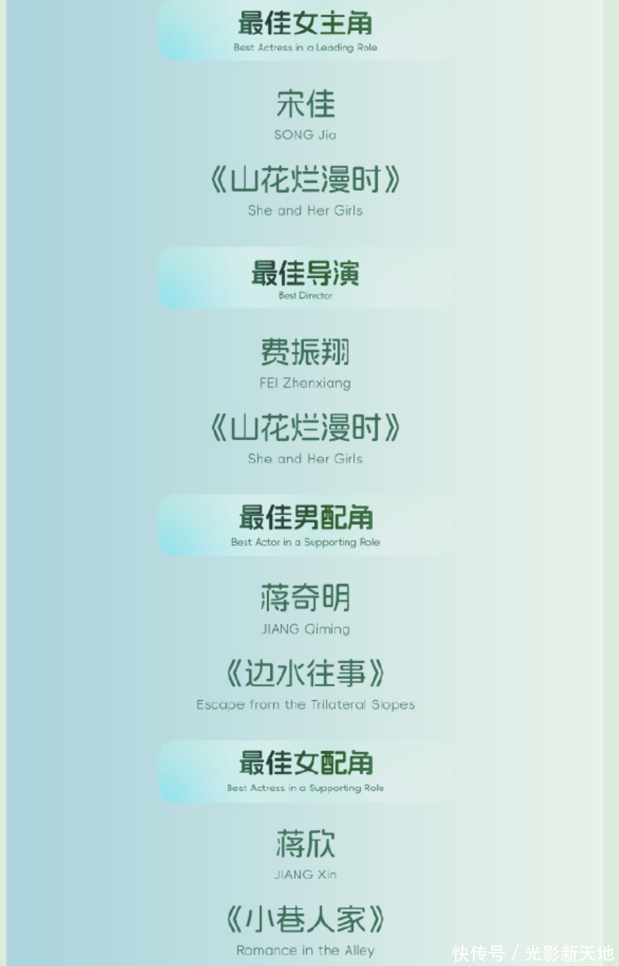 而让我感动到热泪盈眶的两个奖,是蒋欣凭借《小巷人家》拿到最佳女配角,宋佳《山花烂漫时》摘得最佳女主角。